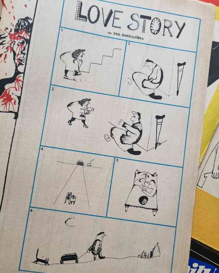 Suspended during World War II, it was resumed in 1945. In 1953 Szpilki was merged with another satirical magazine, Mucha.